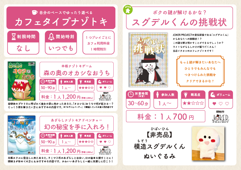 カフェタイプナゾトキ 2026年1月23日 by asovivajoker カフェタイプナゾトキ 予約不要で楽しめます 1つプレイごとにカフェスペース料金が1時間分無料! 1人1つのご購入をお願いいたします ・新着カフェナゾトキ 他にも当店オリジナル作品・委託作品をご用意しております!