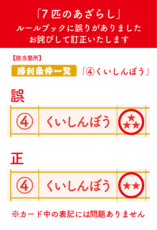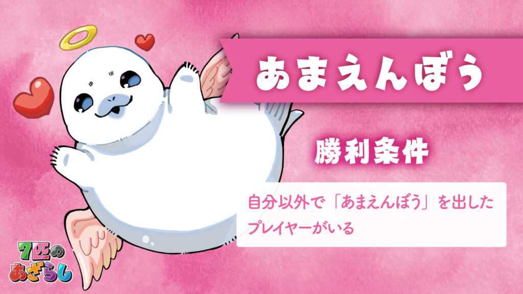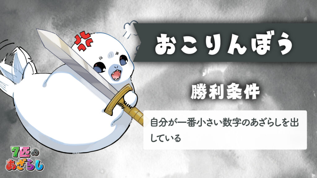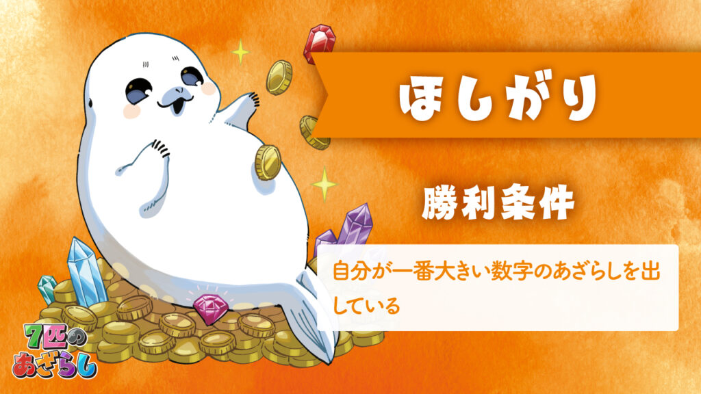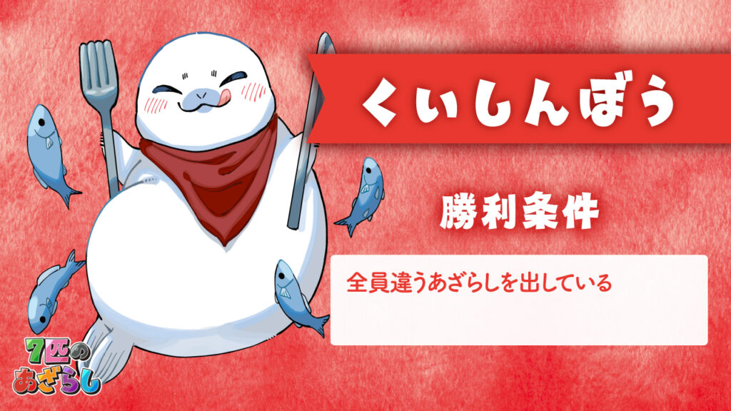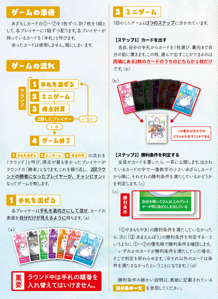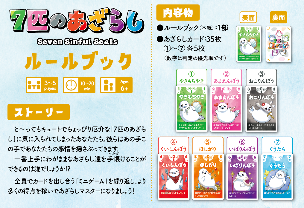 7匹のあざらし 2025年11月26日 by jokerproject ルールブック内の誤植に関するお知らせ お知らせ ◆ルールブック内エラッタ情報のお知らせ ◆2025年11月22日・23日、ゲームマーケット2025秋にて新発売! ◆ゲームマーケット後、順次ボードゲーム専門店などで流通開始予定 キャラクター紹介 ルール紹介動画 ゲームルール その他のゲーム・ボードゲーム2人専用推理ゲーム「ミステリーテリングゲーム」