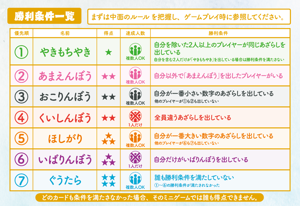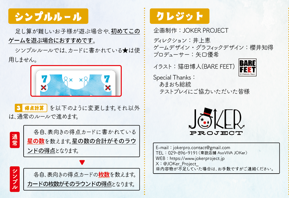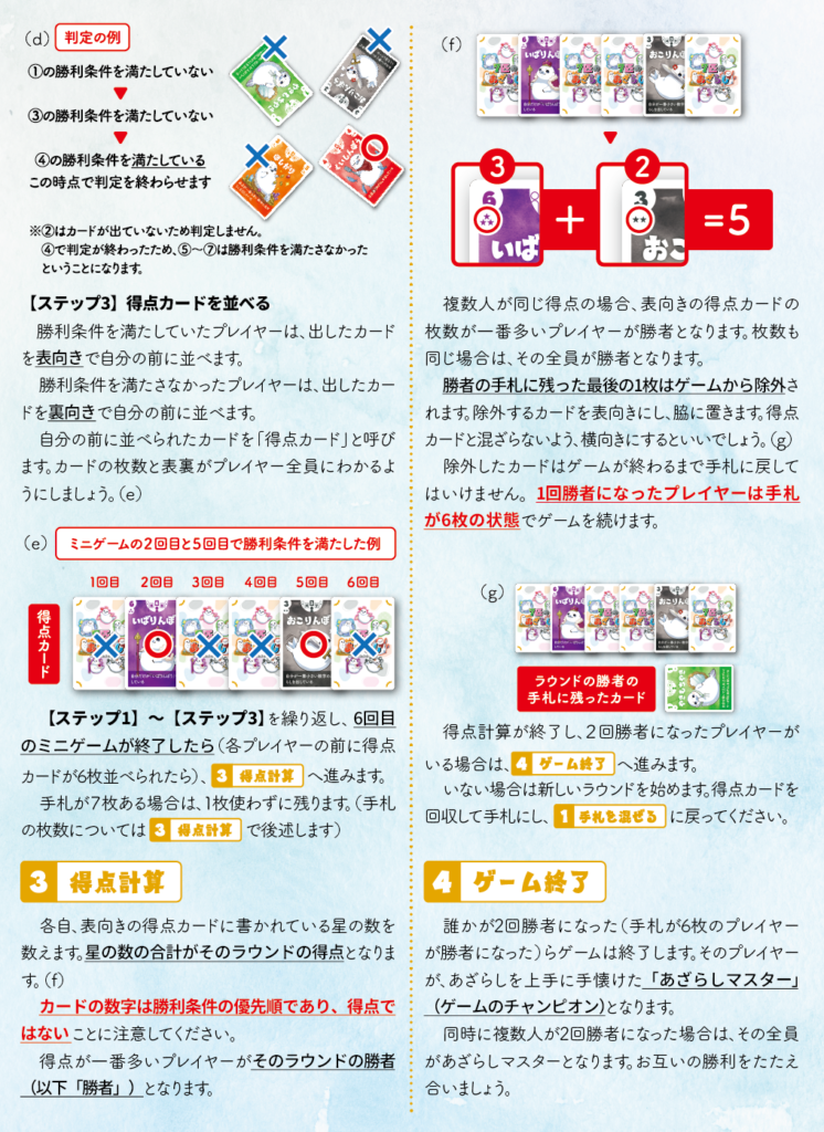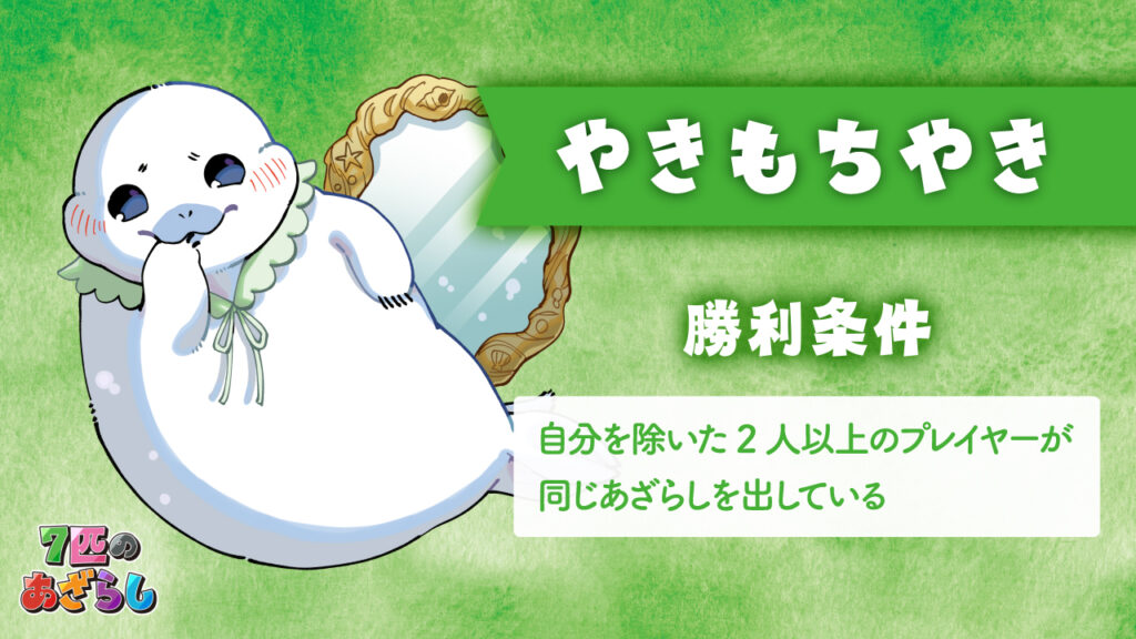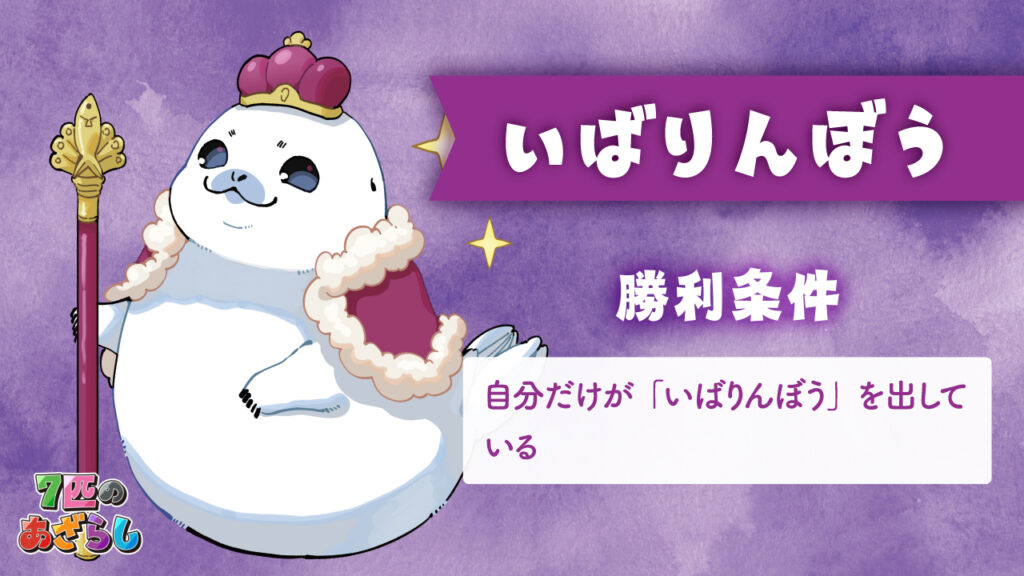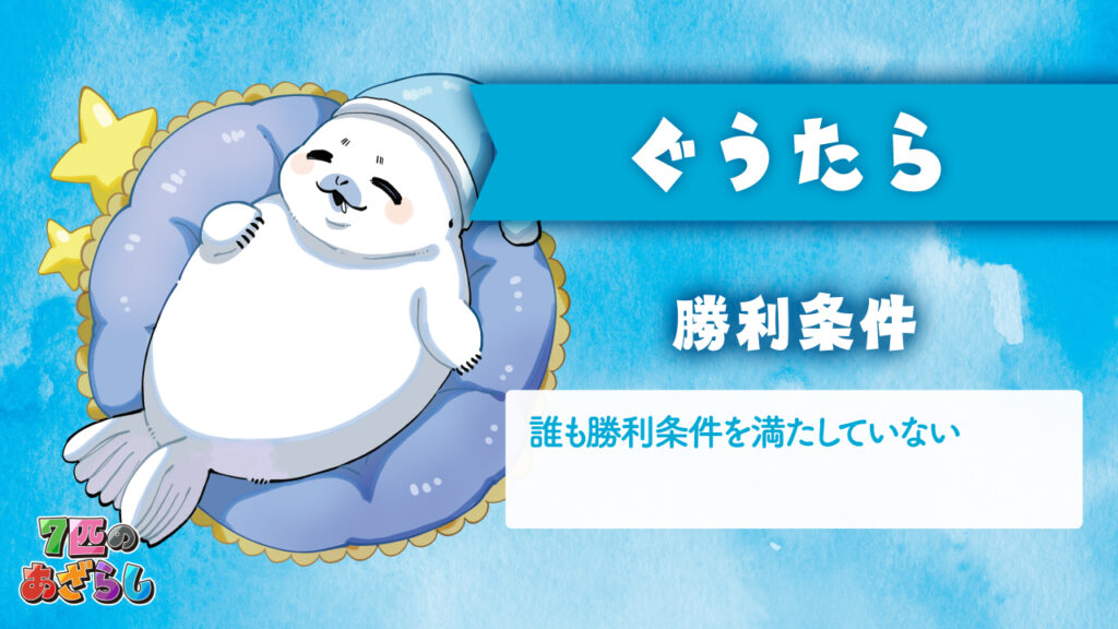 7匹のあざらし 2025年11月26日 by jokerproject ルールブック内の誤植に関するお知らせ お知らせ ◆ルールブック内エラッタ情報のお知らせ ◆2025年11月22日・23日、ゲームマーケット2025秋にて新発売! ◆ゲームマーケット後、順次ボードゲーム専門店などで流通開始予定 キャラクター紹介 ルール紹介動画 ゲームルール その他のゲーム・ボードゲーム2人専用推理ゲーム「ミステリーテリングゲーム」